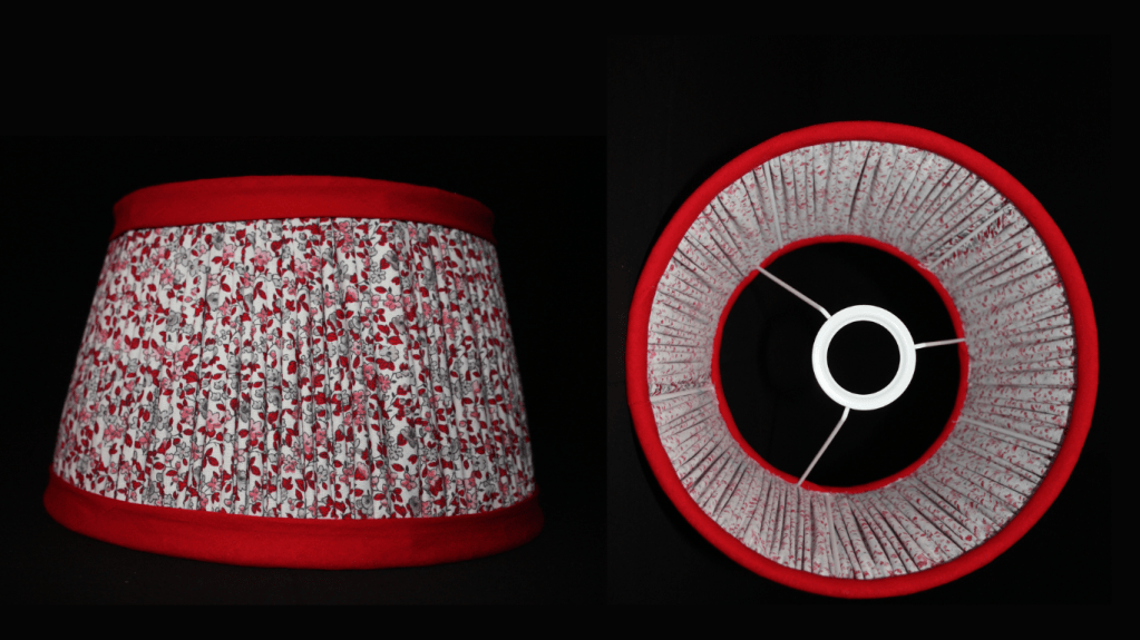 Abat-jour forme tambour. Extérieur : Tissu en coton blanc fleuri rouge avec un biais rouge de 5 cm de haut en haut et en bas. Fabrication plis et couture main. Entièrement fait main.