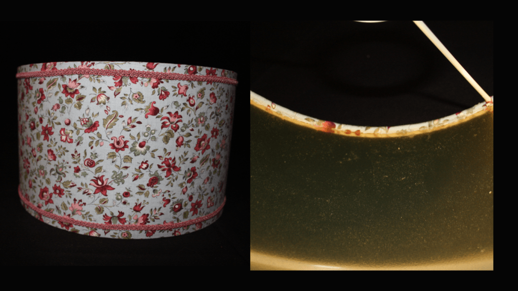 Abat-jour tendu de forme conique. Extérieur: confectionné en taffetas rose intérieur: satin rose, doublure soigneusement posée. Sur chaque pli, une soutache dorée est posée. Un galon vieux rose entoure le haut et le bas. Fabrication : plis et couture main. Entièrement fait main.