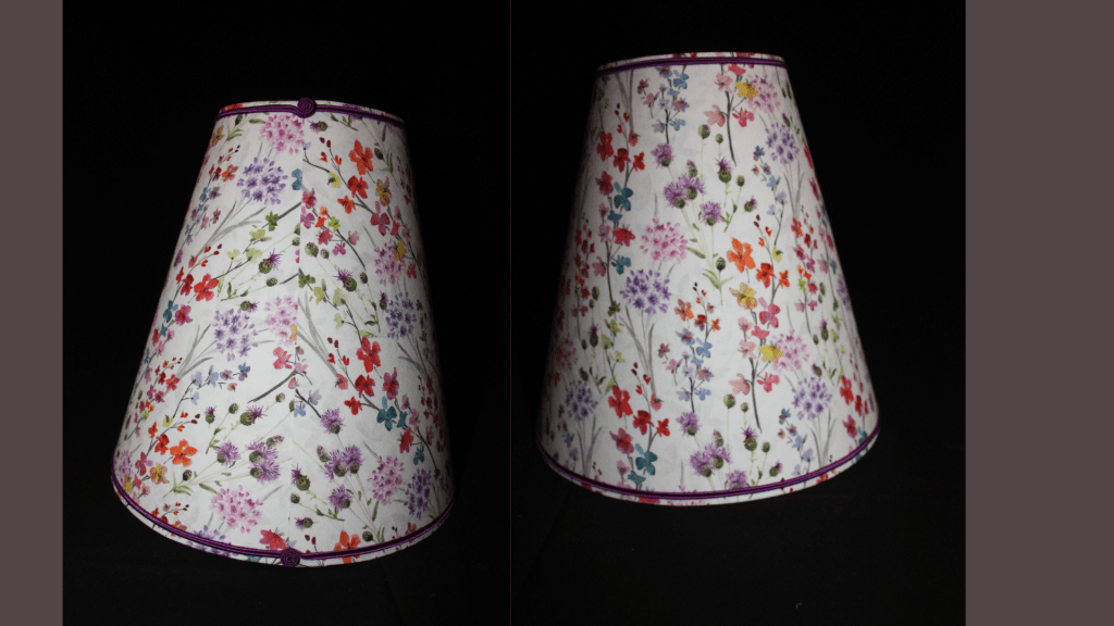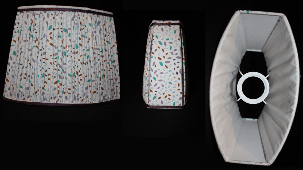 abat-jour sur carcasse en pan coupé. Les faces, les plus grandes sont plissées et cousues à la main. Les deux petits côtés sont du polyphane blanc recouvert de coton imprimé. L’abat-jour est doublé de coton blanc cousu main. Il est soutenu par un biais intérieur et extérieur violet ponctué de points orangés.