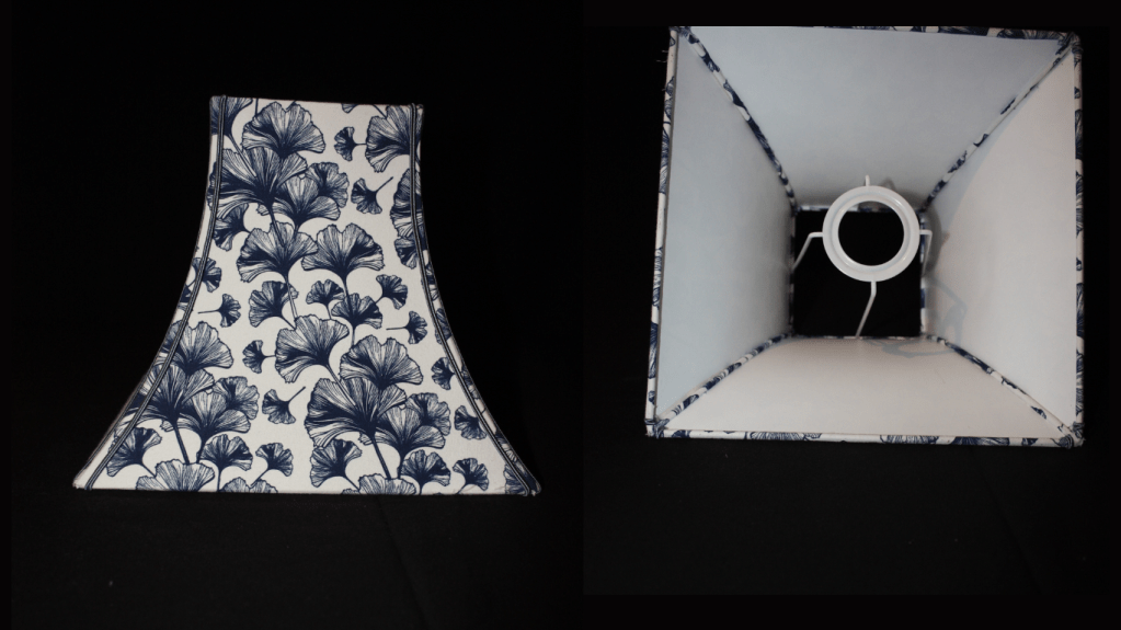 Abat-jour forme pyramidale, en polyphane blanc recouvert de coton aux motifs ginkho bleu, soutenus par des soutaches bleus sur les quatre faces.
