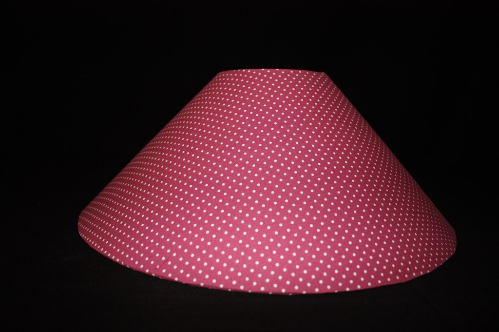 Abat-jour en polyphane blanc en forme de chapeau évasé recouvert de coton fuschia à poids blanc.