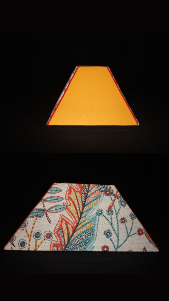 Abat-jour forme pyramidal. Extérieur: des deux grands côtés du lin à motifs feuilles colorés jaune, rouge, et bleu. Les deux plus petits côtés sont en coton jaune avec de la soutache rouge sur les tranches longues. Fabrication: Carcasse recouverte de polyphane et coton. Entièrement fait main.