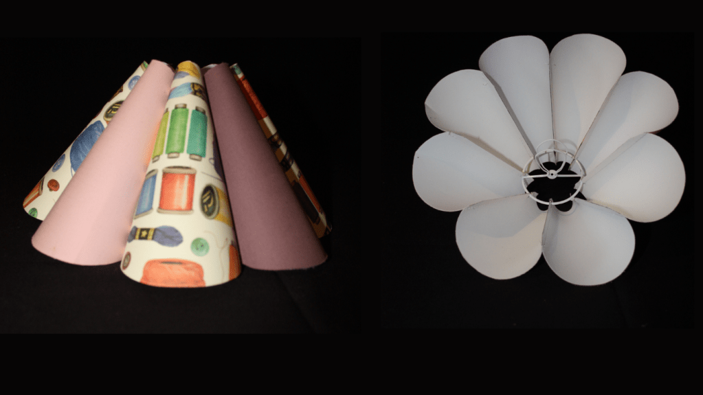 Abat-jour godron en polyphane blanc recouvert de tissus et de papier. Décor bobines de fil et de boutons pour les amatrices de travaux de fil et d’aiguilles. Assemblé par couture. Attention abat-jour avec une pince flamme! Petite ampoule conseillée.
