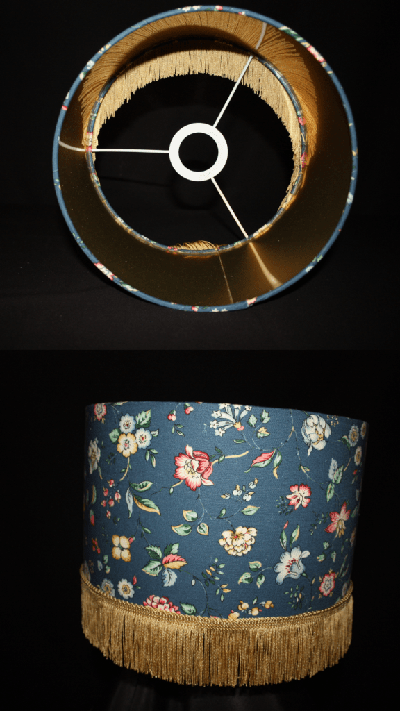 Abat-jour forme cylindrique, intérieur doré recouvert à l’extérieur d’un tissu en coton bleu imprimé de fleurs roses, jaunes, bleues et de feuilles vertes délicates. Il est entouré à l’extérieur d’un double rang de franges dorées. Fabrication: en polyphane et coton. Entièrement fait main.