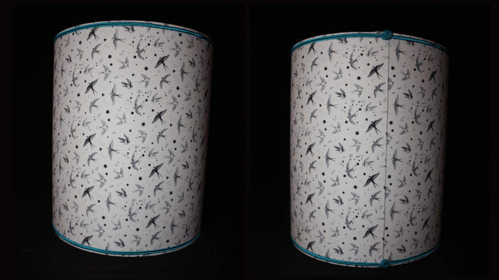 Abat-jour en polyphane blanc recouvert de coton blanc cassé aux motifs noir et gris d’hirondelles en vol entouré en haut et en bas par de la soutache bleu turquoise.