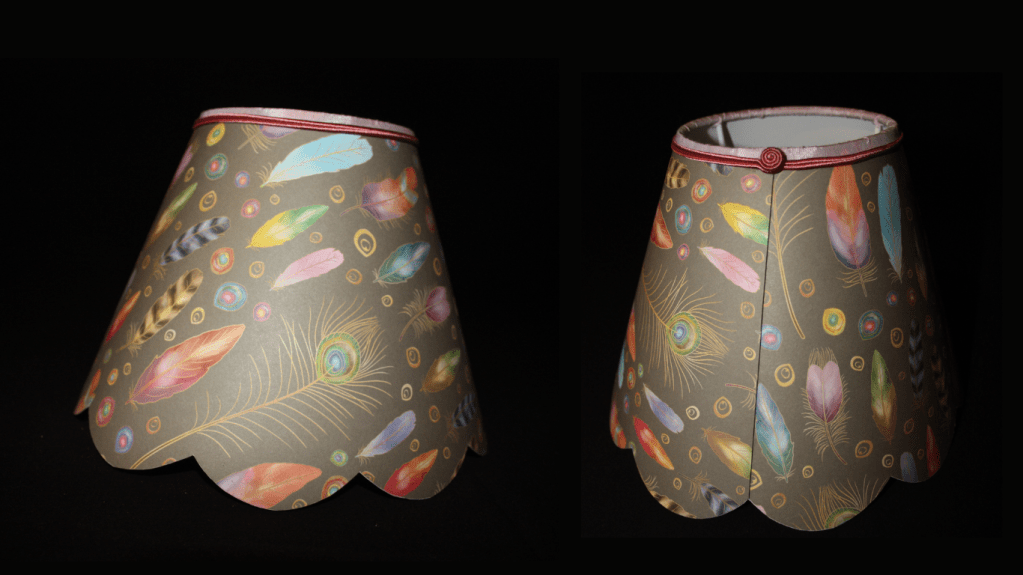 abat-jour forme conique à festons. Extérieur: recouvert de papier fantaisie aux plumes colorées, le bord haut est recouvert d’un biais rose nacrée est soutenu par une soutache rose. Fabrication: polyphane recouvert de papier. Entièrement fait main.