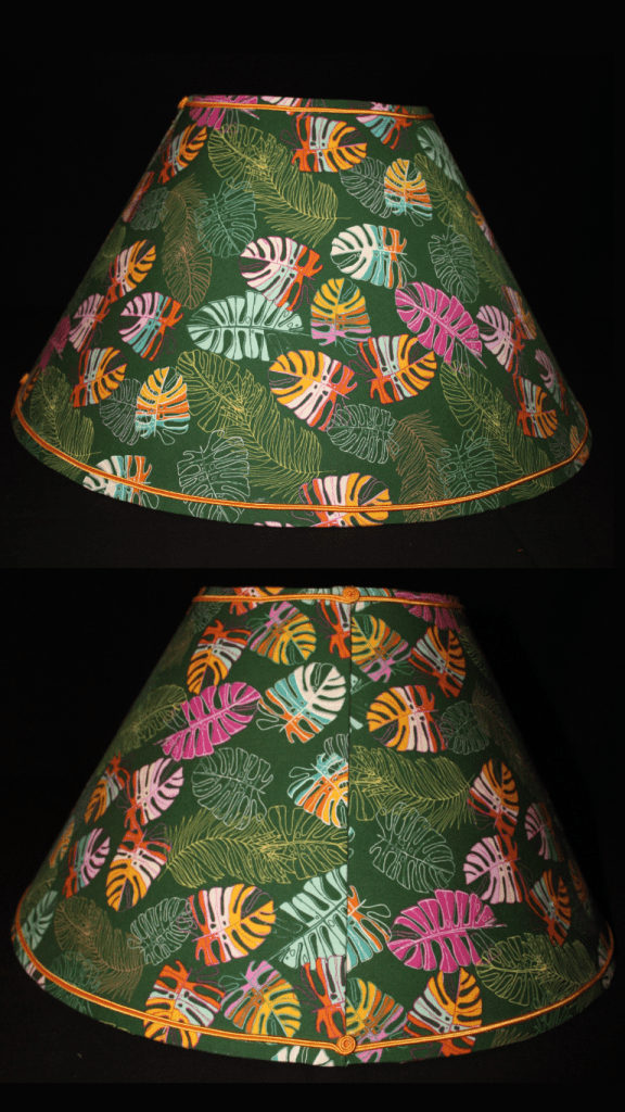 abat-jour en polyphane blanc recouvert de tissu en coton au fond vert intense aux motifs de feuilles tropicales aux couleurs rose, jaune, turquoise et vert feuille. Le tout entouré de soutache en haut et en bas orange.