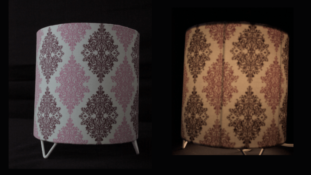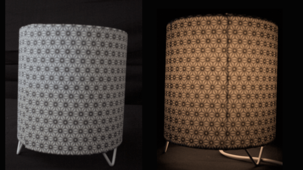 abat-jour en polyphane blanc recouvert de tissu type lin à motif mandalas.
