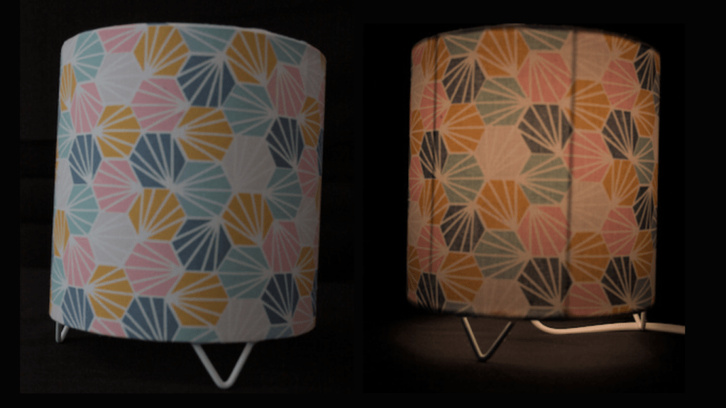 Abat-jour forme cylindrique sur carcasse en polyphane blanc recouvert de tissus de coton aux motifs géométriques rose, bleu, ocre, gris perle. Vendu avec son cordon électrique de 2m comprenant une fiche, une douille et un interrupteur.