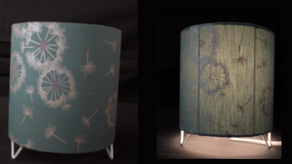 Abat-jour forme cylindrique sur carcasse en polyphane blanc recouvert de tissus de coton vert de gris aux motifs de pissenlits argentés. Vendu avec son cordon électrique de 2m comprenant une fiche, une douille et un interrupteur.