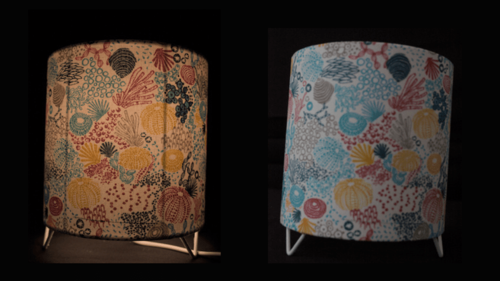 Abat-jour forme cylindrique sur carcasse en polyphane blanc recouvert de tissus de coton aux motifs marin/coraux: jaune, rouge, bleu ciel, bleu foncé. Vendu avec son cordon électrique de 2m comprenant une fiche, une douille et un interrupteur.